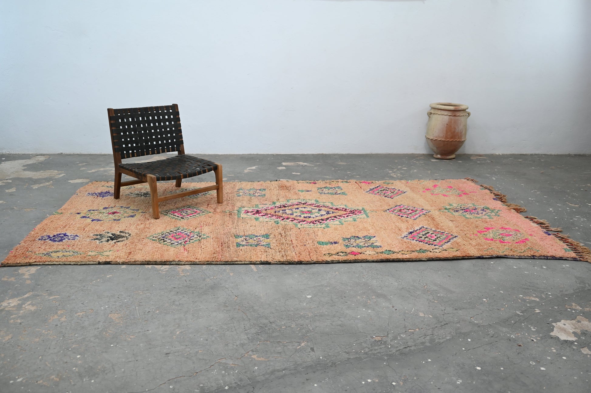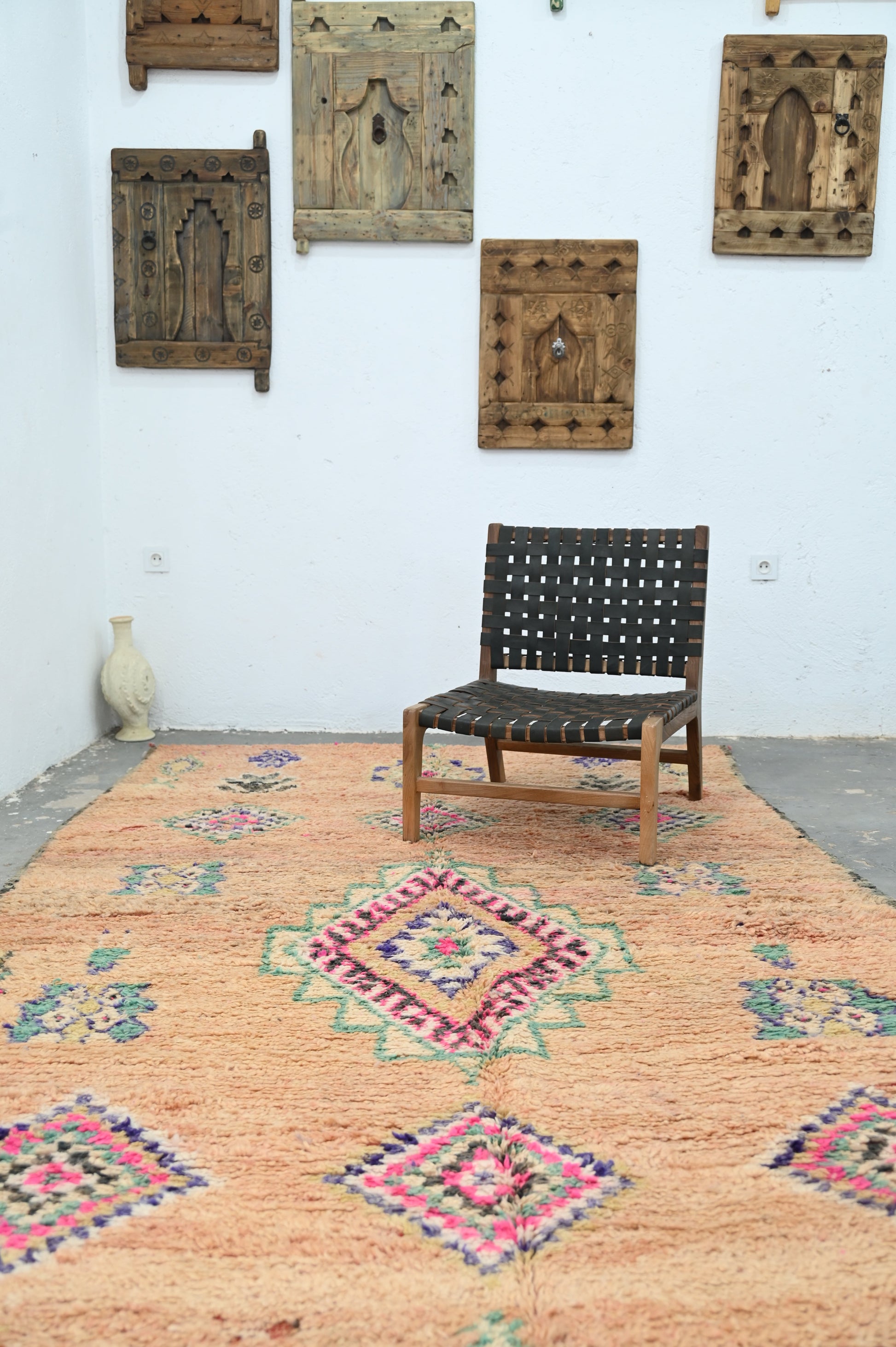 Réputés pour leur mélange harmonieux de couleurs chaudes et de motifs traditionnels, nos tapis Boujaad ou la tribu Beni M'Guild apportent un style rustique et sophistiqué, parfaitement en phase avec les tendances actuelles en matière de décoration. Chaque tapis est une œuvre d'art unique, témoin des histoires et traditions des tribus locales.